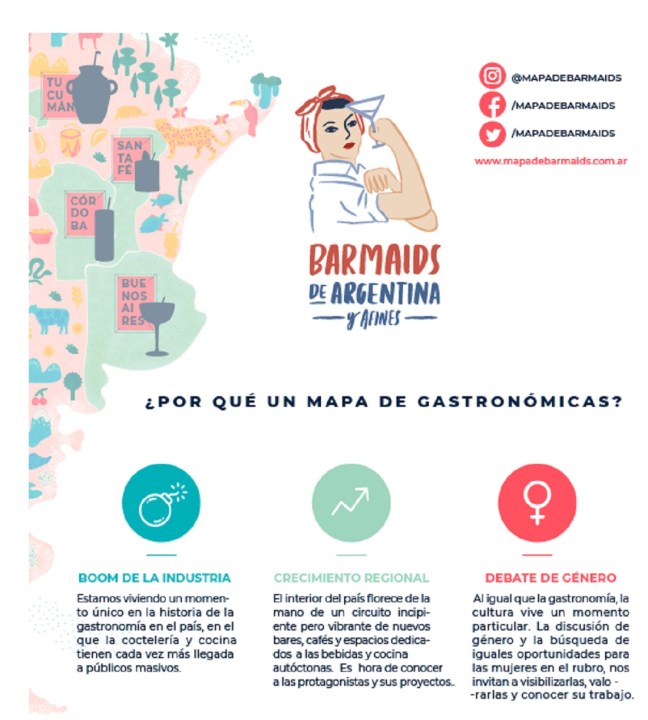 Mapa de Barmaids y Afines se trata de una ONG basada en Buenos Aires, aunque mapean mujeres y disidencias (LGBTQIIA+) profesionales en distintos países. Trabajan en tres áreas dentro del sector de la hospitalidad: género, salud y formación. Hace tres años que esta ONG viene caminando y alcanzando un lugar de referencia en el sector gastronómico. El Mapa es la herramienta de comunicación y registro de visibilización y empoderamiento femenino en el rubro gastronómico en Latinoamérica.