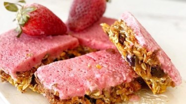 Aparte mezclar el yogur con la gelatina sin sabor y colocarlo la preparación anterior. Llevarlo al freezer por 2 horas. Retirar y cortar las barritas.