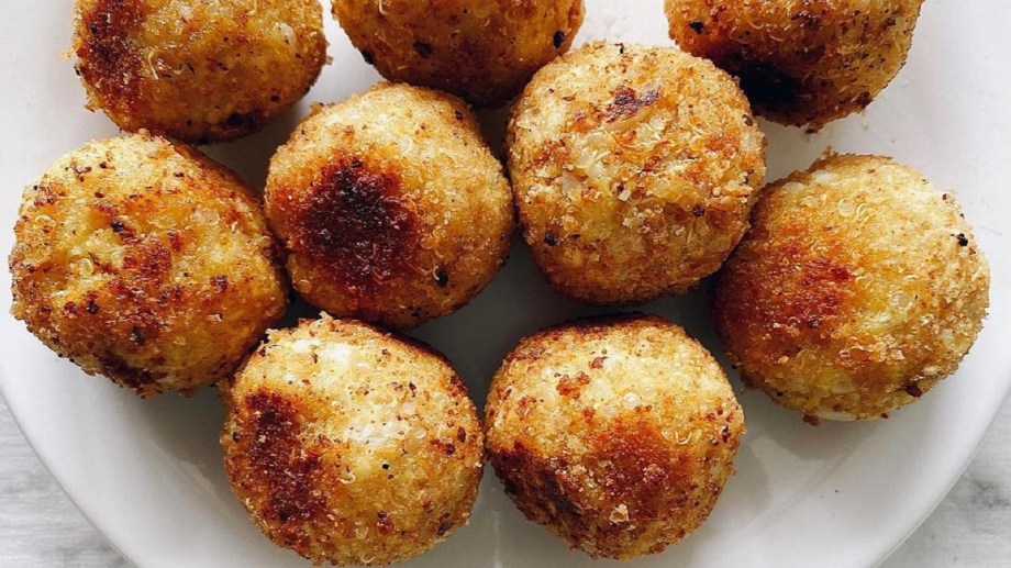 Formamos bolitas y las pasamos por harina de arroz primero (puede ser integral o avena). Luego pasamos por huevo y rebozamos. Cocinamos en una sartén con un poco de rocío vegetal hasta dorar.