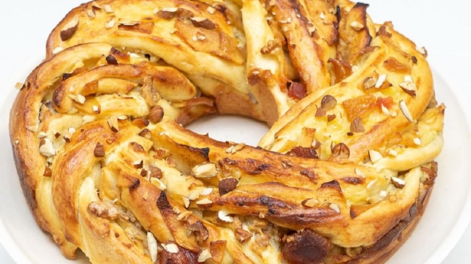 4. Enrollar y trenzar. Disponer en molde savarin. Dejar fermentar hasta que aumente su volumen un 60%. Pincelar con huevo y leche y espolvorear con frutos secos.