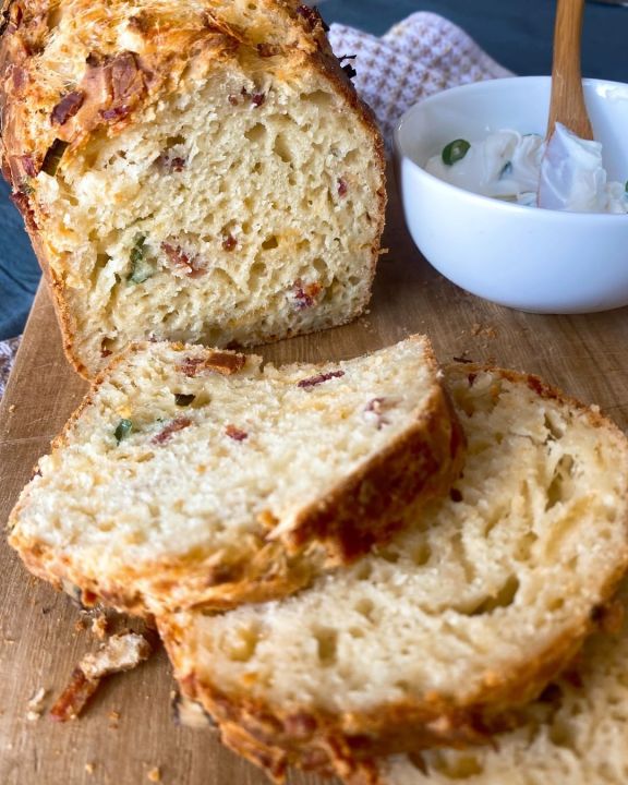 En otro bol mezclar la harina junto con la levadura, el bicarbonato y la sal. Agregar ¾ partes de la panceta, el queso en hebras y el verdeo picado. Sumar los líquidos y mezclar hasta obtener una mezcla uniforme.