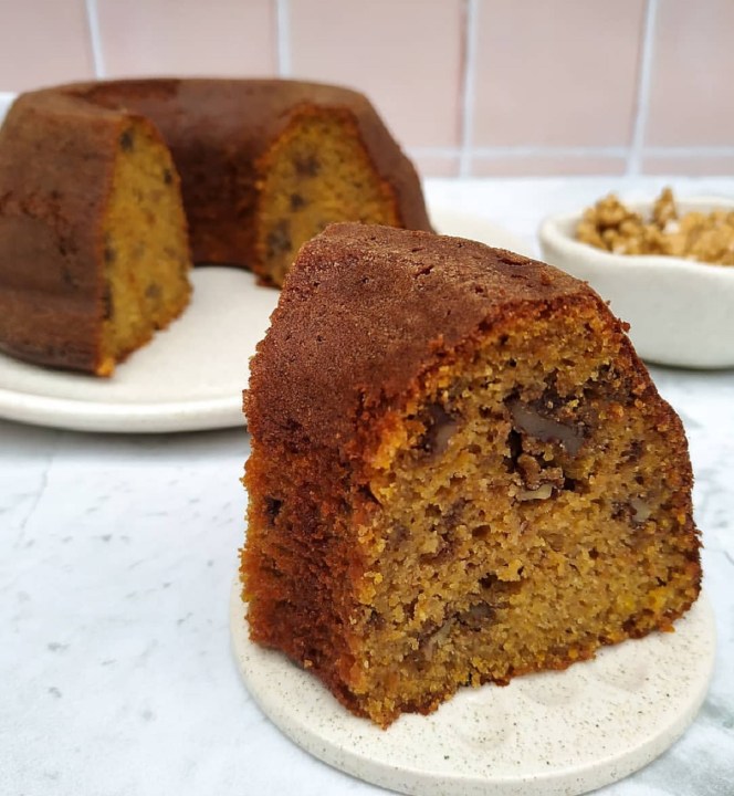 5. Volcar la masa en un molde enmantecado y enharinado. Llevar a un horno precalentado 180° por 30/35 minutos. Siempre comprobar que esté cocido pinchando con un cuchillo. Dejar reposar en el horno con la puerta apenas abierta durante 10 minutos para que el budín no se baje. Desmoldar sobre una rejilla y dejar enfriar.