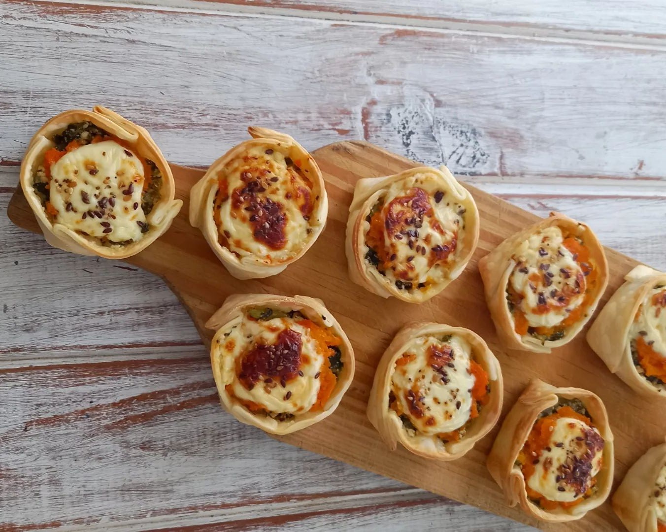 Armar las canastitas en una asadera previamente aceitada. Colocar primero un poco del relleno de acelga, después un poquito del puré de calabaza y por último un cubito de queso cremoso. Arriba le puse un poquito de mix de semillas.