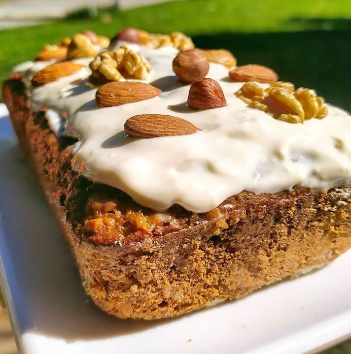 Mezclar 4 cdas de queso untable o yogur natural + edulcorante + vainilla y cubris el budín. Decorar con más frutas secas enteras.