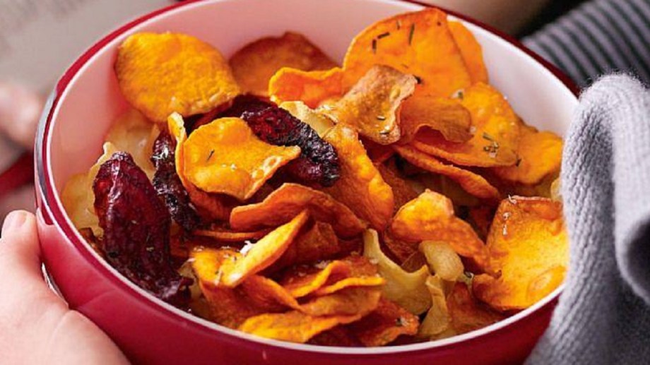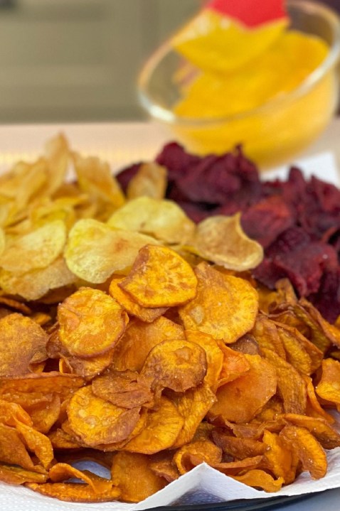 Cortar en láminas bien finas, papas, batatas, remolachas y si querés calabaza. Freír todos los vegetales en abundante aceite, no muy caliente, para que queden bien crocantes. Dejar escurrir en papel absorbente.