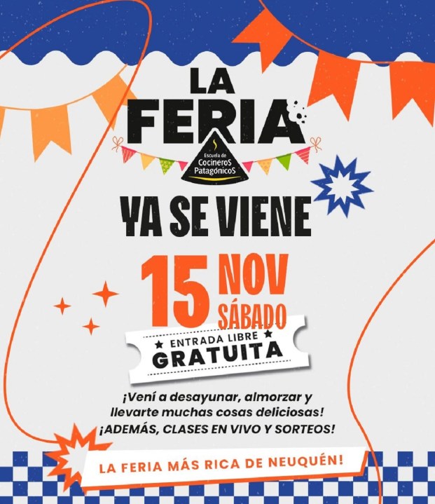 Cocineros Patagónicos anuncia la realización de la 10° edición de La Feria, el evento anual que reúne a alumnos y egresados emprendedores que presentan, además de comercializar sus productos gastronómicos ante la comunidad. La actividad es el sábado 15 de noviembre, de 10 a 14, en la vía pública frente a la sede de Juan XXIII 1255, Neuquén capital.