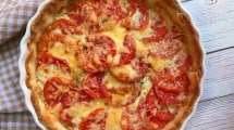 Colocar el relleno en el molde con la masa precocida. Incorporar la mozzarella en rodajas en la parte superior y cocinar en horno hasta que esté dorada la mozzarella.