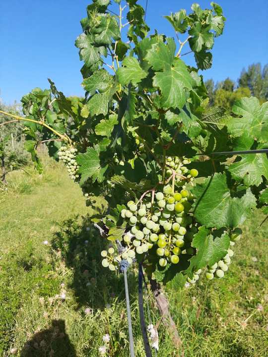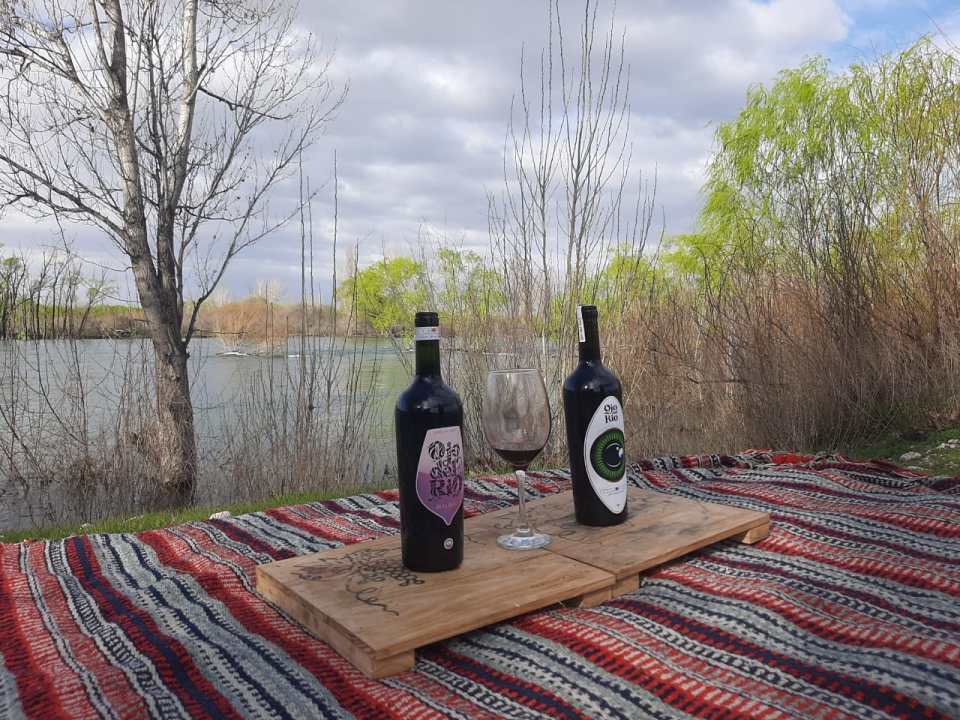 Con una pequeña plantación de uvas, elaboran la marca de vino Ojo del Río. Trabajan con tres variedades de uva: Chardonnay, Cabernet franc y Malbec. Realizan cosechas nocturnas para controlar la temperatura de la uva y evitar las fermentaciones bacterianas. «La intención siempre fue hacer un cultivo agronatural. Lo más que hacemos es la poda, para ayudarlas en la conducción hacia la exposición solar, pero no intervenimos en la alimentación y conviven con toda la flora nativa», describió el dueño.