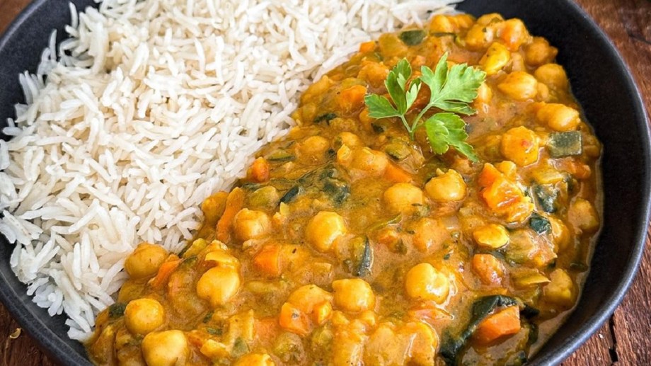 Mezclar bien durante un par de minutos y agregar la leche de coco. Integrar y cocinar 10 minutos a fuego medio tapado. Agrega el puñado de espinacas cortadas y en un par de minutos estará listo el curry.