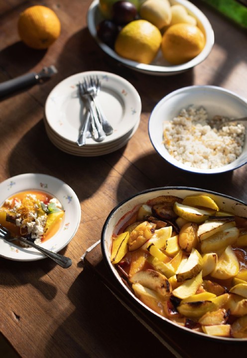 Cortar las frutas al medio o en cuartos parejos bien lavadas y colocarlas en una fuente de horno junto con el edulcorante, manteca, canela y jugo de naranja. Cocinarlas en un horno caliente hasta que estén doradas y cocidas. ¡Ojo! No puré, se puede hacer con cualquier fruta. Servirlas con el jugo de cocción y crema de ricota.