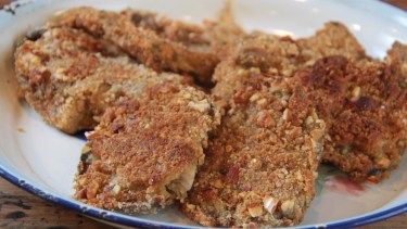Por otro lado, batimos los huevos con ajo y perejil picado. Remojamos las gírgolas en la mezcla de huevos y las pasamos por las almendras. Luego, doramos en una sartén con aceite de oliva. Servimos.