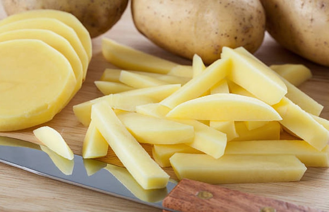 Pelás las papas y les hacés una base para poder cortarlas sin que se resbalen en la mesada. Cortá rodajas de 5 a 7 mm a lo largo de la papa. Amontonalas y luego cortá bastones del mismo ancho. Te van a quedar palitos cuadrados y parejitos. Es fundamental cortar las papas del mismo tamaño. Si las cortás desparejas, más gruesas de un lado y finas del otro, la fritura saldrá mal, aunque usted no lo crea.
