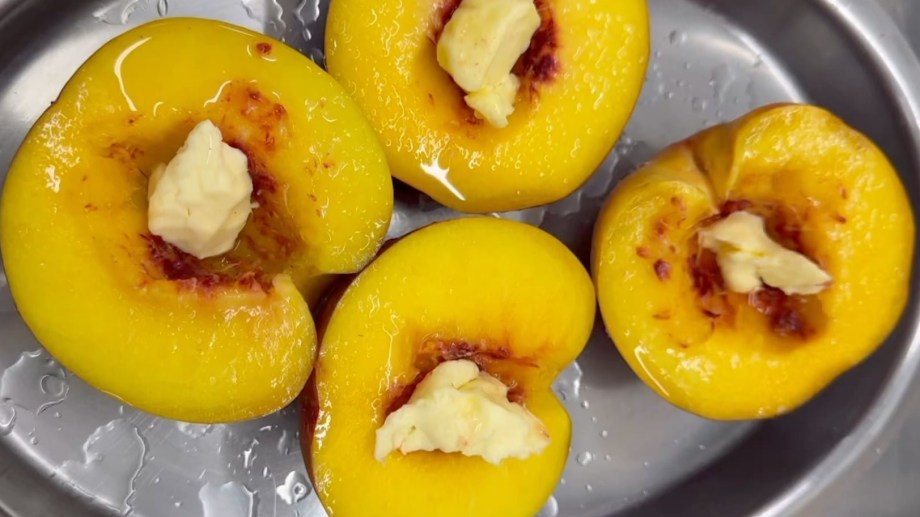 La cantidad de duraznos queda a gusto tuyo. Vas a lavarlos, cortar al medio y quitar los carozos. Vas a ponerles 1 cucharadita de manteca y espolvorear con azúcar. Podemos rociar con jugo de limón.