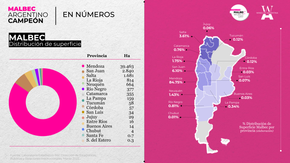 Con presencia en 17 de las 24 provincias argentinas, el equivalente al 70.8% del territorio, y 46.565 hectáreas plantadas en el país, el Malbec representa el 24.3% de la superficie total cultivada con vid en Argentina (destinada a elaboración) y el 40.8% de la superficie de variedades tintas (de elaboración).