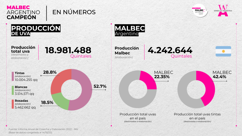 El “Messi del vino”, como se ha denominado al varietal siguiendo una analogía futbolística, se posiciona al frente de la producción de uva en el país con 4.242.644 quintales, lo cual representa el 22.35% del total de uva ingresada a establecimientos destinada a elaboración y, más específicamente, el 42.4% del total de tintas para vinificación.