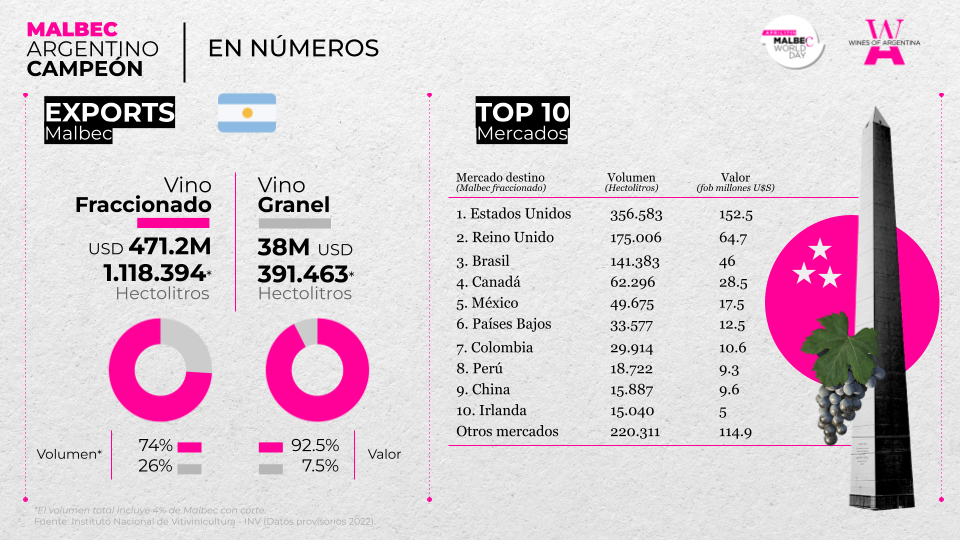 De estas cifras, el Malbec fraccionado representa el 74% en volumen con 1.118.394 hl y el 92.5% en valor, con USD 471.2 millones (datos provisorios INV).