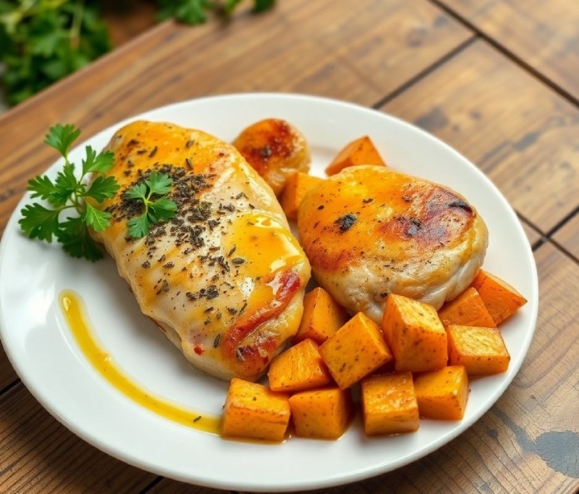 JUEVES: Pechugas de pollo con pesto de aceitunas y batatas horneadas