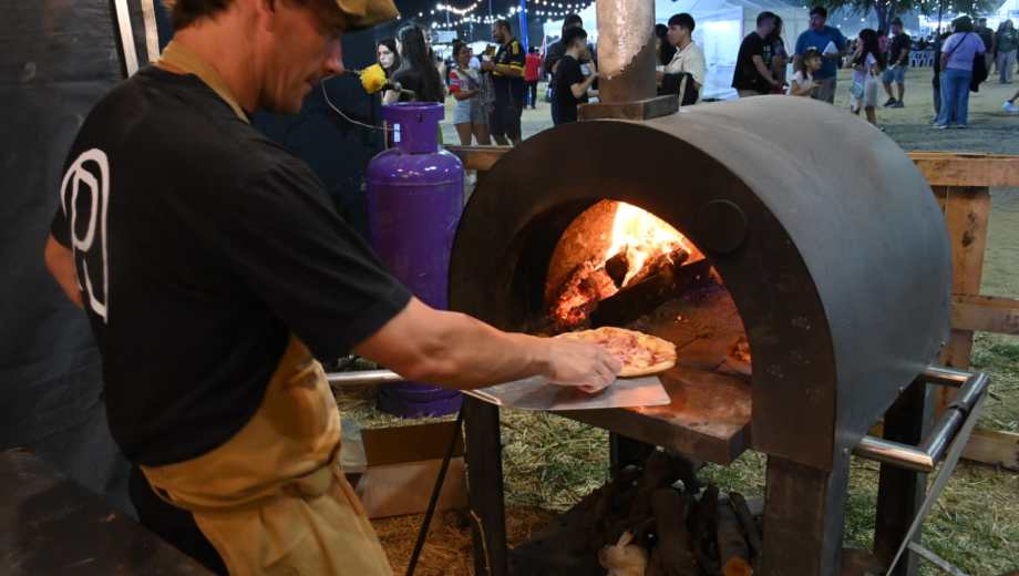 La pizza recién salida del horno a leña, lista para ser disfrutada, en «Raïs», en esta FNM. Foto: Alejandro Carnevale