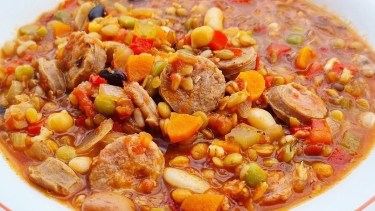 En una ollita con un toque de oliva doré la panceta cortada en cubitos pequeños. Al minuto le agregué las verduras también cortadas en cubitos. Cociné un rato y levante el fondo con el vino blanco. Después fue el turno del tomate, el caldo, las legumbres y las especias. Último mandé enteros los choricitos crudos y los cociné en el mismo guiso.