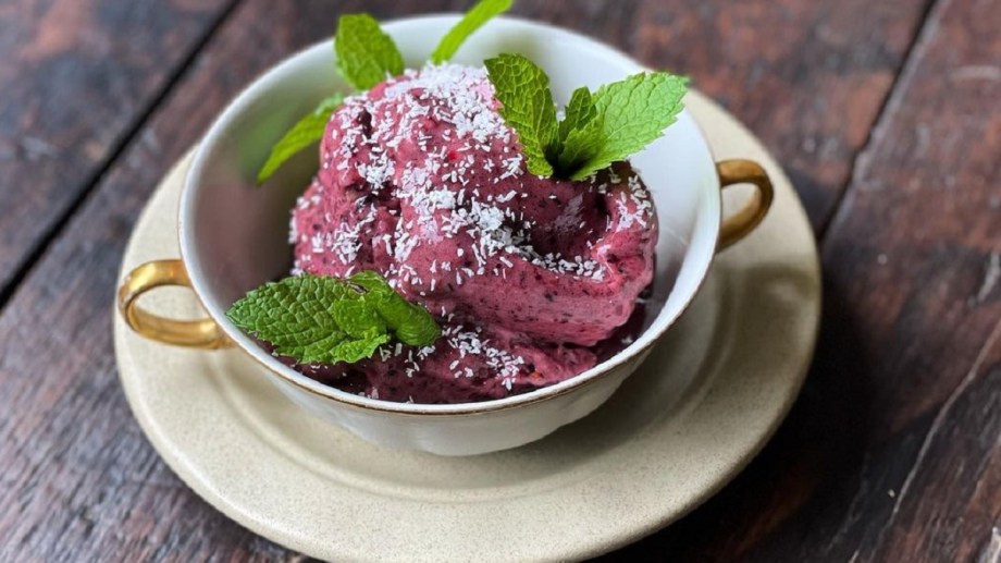 Cortar una banana y llevarla al freezer. Una vez congelada colocarla en la licuadora: banana, frutos rojos congelados, las 2 cucharadas de yogur y licuar hasta obtener un helado cremoso. Servirlo enseguida con hojas de menta fresca y coco.