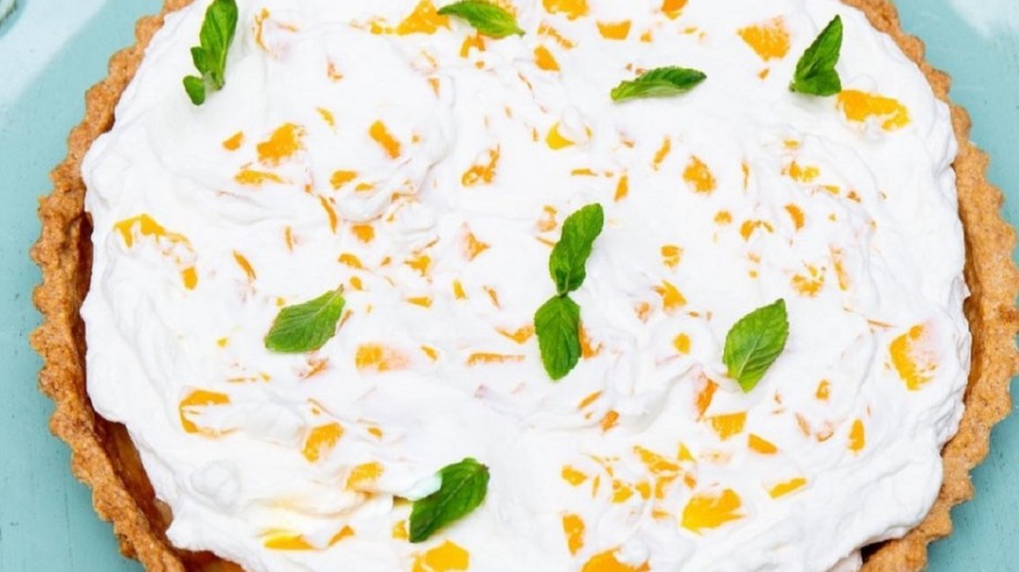 Rellena la masa de tarta con los duraznos, reservando algunos para la decoración.