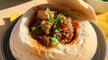 Cortar 1 tapa al pan de campo. Ahuecar. Rellenar con el guiso. Decorar con perejil picado opcionalmente.