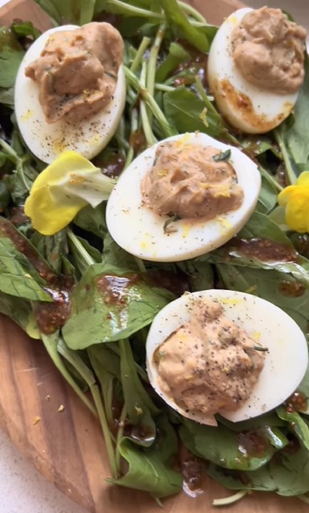 Rehogar en sartén una cebolla picada sal y pimienta. Mezclar yemas duras con cebolla rehogada y 1 taza de espinaca blanqueada, picada. Rellenar los huevos y terminar con panceta crocante (secada en horno). Servir sobre salsa de tomate.