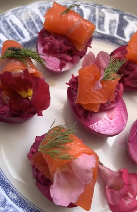 Cocinar 2 tazas de agua, 1 taza de vinagre, 1 cda de sal gruesa y 2 remolachas en trozos hasta obtener una infusión púrpura. Dejar enfriar y macerar allí los huevos duros, pelados, enteros durante 12- 18 horas. Retirar y reservar. Asar una remolacha en horno, envuelta en aluminio hasta que esté tierna. Pelar, rallar y mezclar con eneldo y cebolla morada, picados fino, queso crema, sal, pimienta y rábano picante (o wasabi en pasta). Rellenar las claras púrpuras, terminar con yema rallada y oliva, o con salmón ahumado y eneldo.