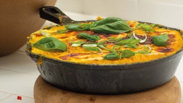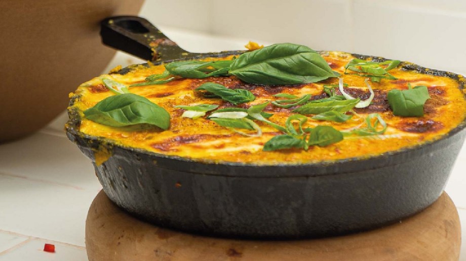 5. Armar la cacerola o sartén de hierro fundido (también podés trasladar el relleno a una fuente para horno) con una base de zapallo, la crema de choclo y el queso.