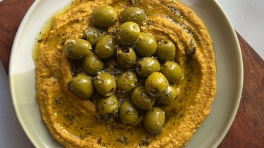 Hummus de zanahorias especiadas con aceitunas aderezadas