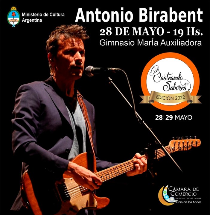 Con la confirmación de la presencia de Antonio Birabent, el anochecer cordillerano del sábado 28 , en JunÍn de los Andes, se llena de música y del arte de este reconocido artista de nivel nacional. Birabent, con su indiscutible sello personal cerrará la primera jornada de la tercera edición del Casteando Sabores, tocando en la sala de exposiciones.