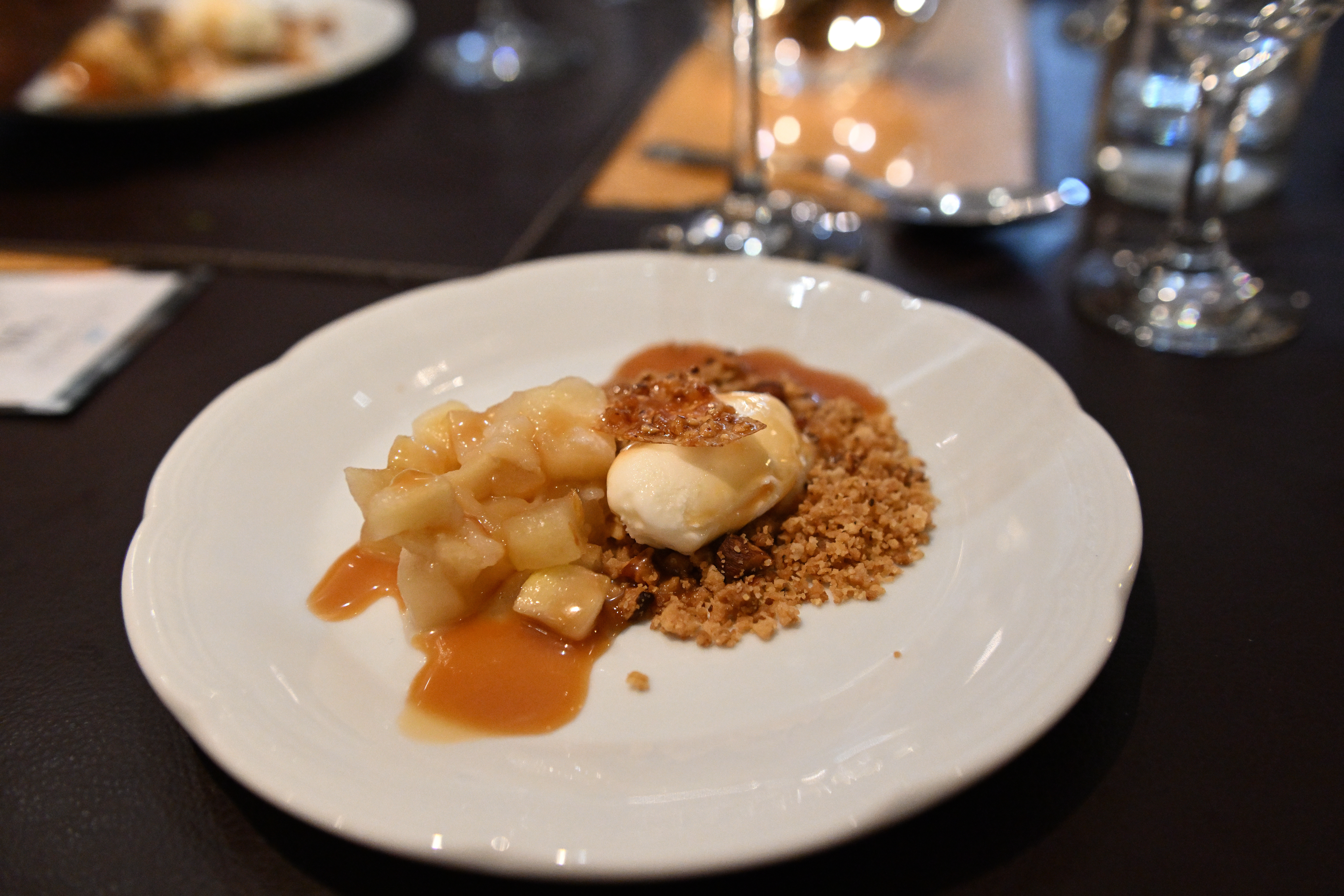 Crumble del valle con crema helada americana, salsa toffee, praliné de piñón y almendras.