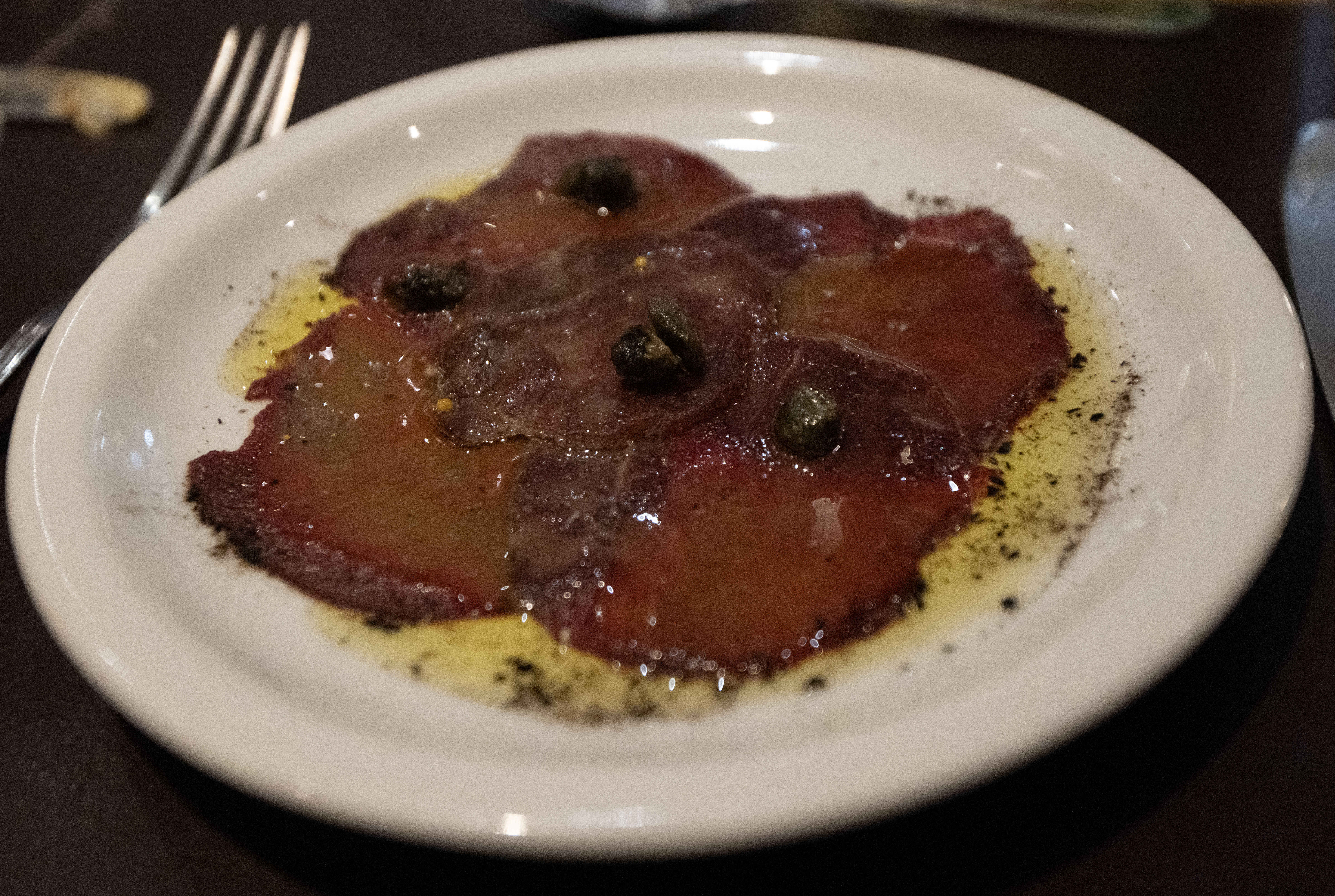 Carpaccio de ciervo con aceite de oliva patagónico, jugo de lima, alpacarras fritas y escamas de sal volcánica.