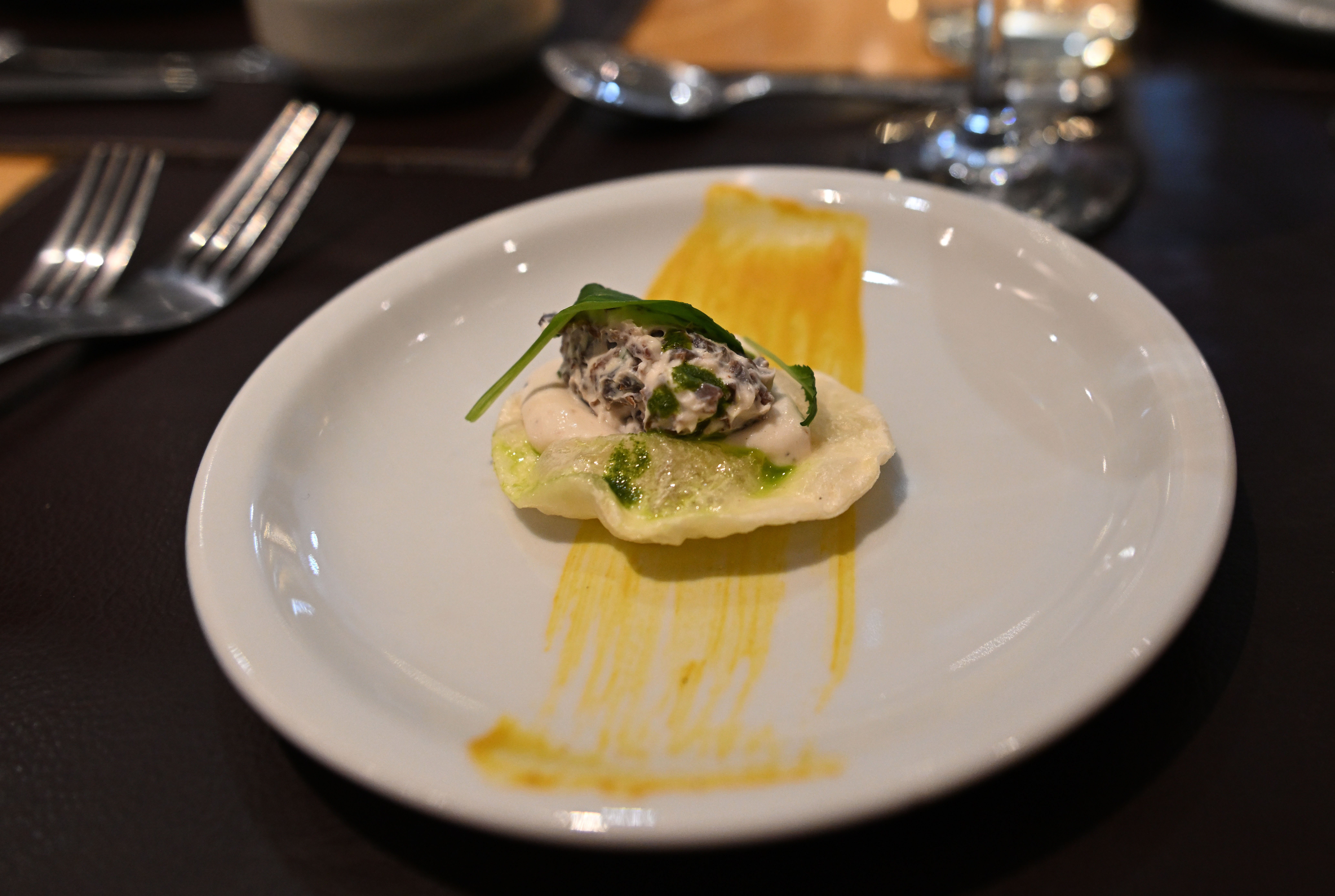 Gnocchis de cabutia, tierra de almendras con crema de morillas silvestres y crocante de parmesano.