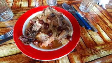 Durante la noche se come lo que halla: arrollado de cerdo, carne, pollo o pavo, pan casero, ensalada, empanadillas de manzanas, quesos caseros. Y de ese “lo que halla” y un poco más, surge una cazuela en una olla del tamaño de la abundancia, donde entran cebollas, ajos, huesos de chancho, tocino seco, pavo, charqui de chivo, chorizos, guindas secas para la acidez, condimentado con pimentón, orégano, una pizca de comino y sal gruesa. Hay quienes agregan una medida de vino y media taza de vinagre. Todo se ha ido juntando en los meses previos, el charqui ha sido maceado, engordado el pavo, preparado el tocino, para llegar a tiempo al almuerzo del 24 de junio.
