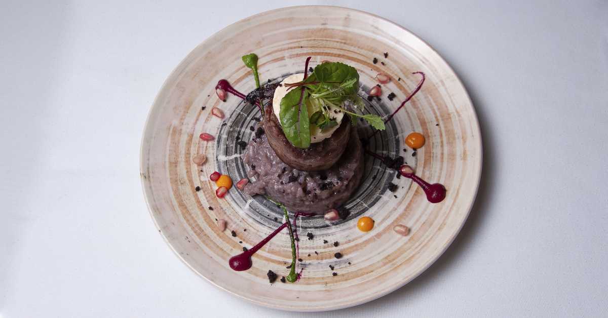 También como parte de las entradas estuvo solomillo de ternera en piel de panceta, manteca de coral, risotto alla lombarda y Malbec sorpresa de granadas y crujiente de olivas negras, con el que acompañaron con el impresionante Malbec Benmarco Sin Límites Gualtallary.