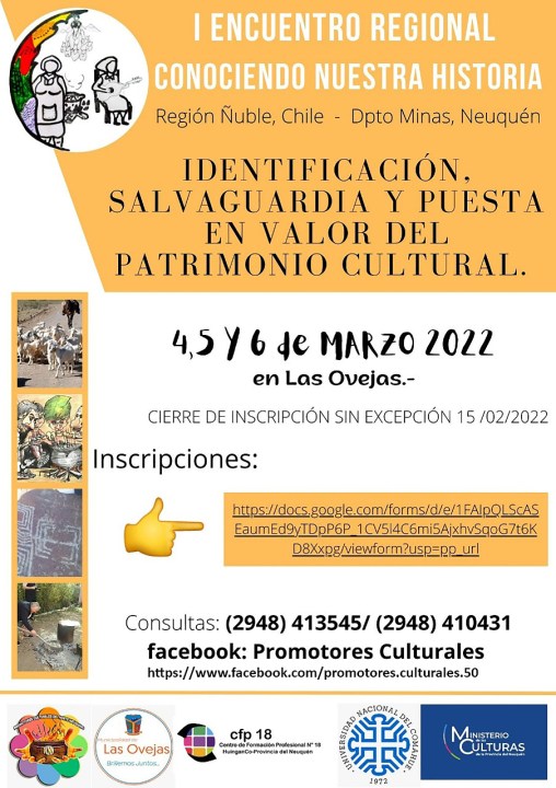 El grupo de Promotores Culturales del Norte Neuquino, junto con la municipalidad de Las Ovejas, el CFP N° 18 de Huinganco, la Facultad de Turismo y el Ministerio de las Culturas del Neuquén son los organizadores de este encuentro regional. De esta forma, invitan a interesados en este campo del saber y del hacer a participar en el evento.