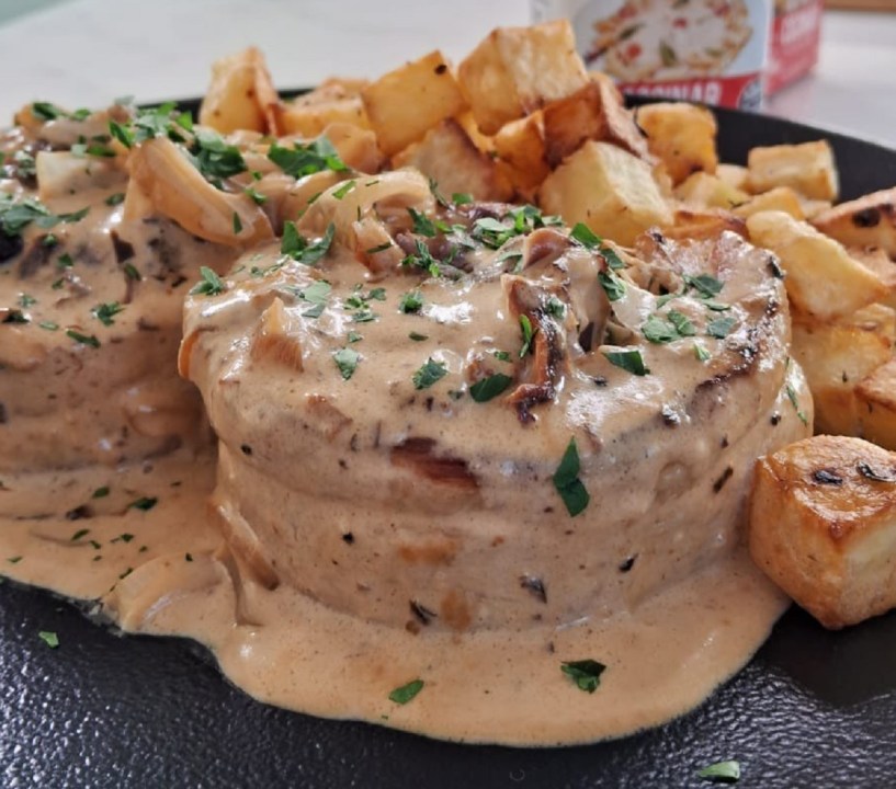 Cocinar en una sartén con aceite, manteca. Una vez dorados cada uno de los lados del medallón incorporar ajo y cebolla blanca. Salpimentar. Cocinar unos minutos antes de agregar la crema para cocinar. Dejar que se cocine a fuego bajo 20 minutos y están listos para servir.
