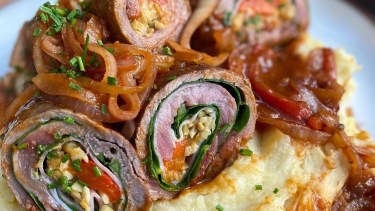 7-Presentar en bandeja los arrollados sobre la salsa de tomate y acompañado con el puré de papas.