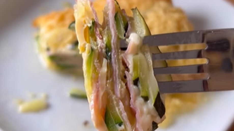 Laminaremos un par de zucchinis con una mandolina o con un cuchillo cortándolos lo más finos posibles. En una bandeja apta para horno pondremos una base de zucchinis, jamón, queso y un poco de huevo batido y repetimos la operación hasta que terminemos con los ingredientes.