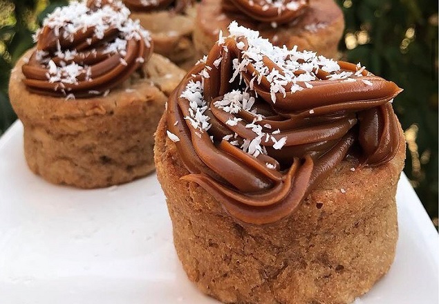 Colocar en la licuadora: bananas, huevo, leche de castañas, edulcorante, pasta de maní, harina de avena, polvo de hornear y procesar. Colocar la preparación en moldes (si no son de silicona, poner rocío vegetal primero). Llevar a horno moderado por 30 minutos (depende de cada horno). Dejar enfriar y decorar con dulce de leche con stevia y coco.