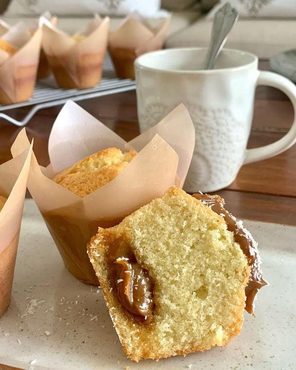Colocar un poco de la mezcla en los moldes para muffins. Agregar un botón de dulce de leche (pueden usar la manga) y cubrir con otra parte de la mezcla (llenar hasta 3/4 de los moldes). Hornear por 30 minutos aproximadamente hasta dorar.
