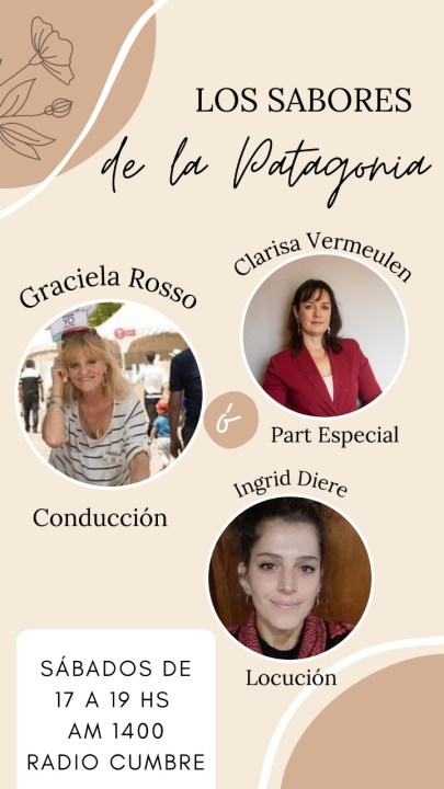 Ocurre que este sábado 30 de abril de 17 a 19 comienza su programa “Los sabores de la Patagonia” por radio Cumbre AM1400, con la locución de Ingrid Diere y la participación especial de Clarisa Vermeulen. Dos asistentes súper jóvenes. La alianza intergeneracional es la clave para crecer y no perder vigencia, razona Graciela.