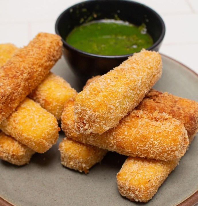 1. Cortar el queso en bastones mozzarella de 3×8 cm pasar por harina, pasar por huevo condimentado, escama de papa, repetir y llevar a la heladera.