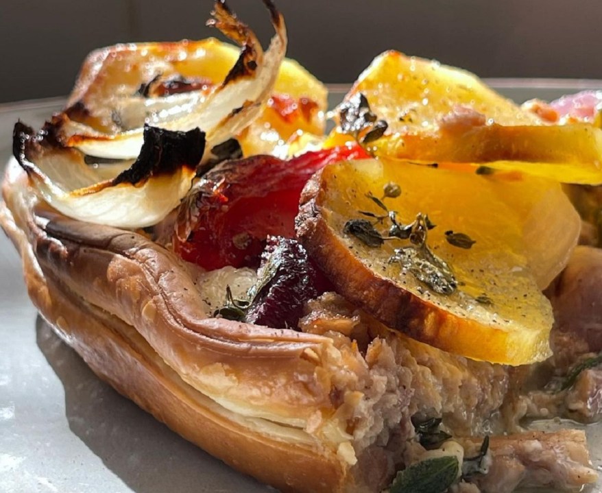 Retirá la masa del horno y hacé un piso de queso muzarella y algún otro rallado grueso. Por encima acomodar las cebollas, tomates y ajíes. Intercalá rulos de panceta ahumada cortada en fetas. Incorporá el atún de una lata y las rodajas de papas que, cuando se hornean, las partes salientes quedan doradas y crujientes, mientras que la mitad se cocina con la humedad del resto de los ingredientes y forma un puré delicioso dentro de la tarta.