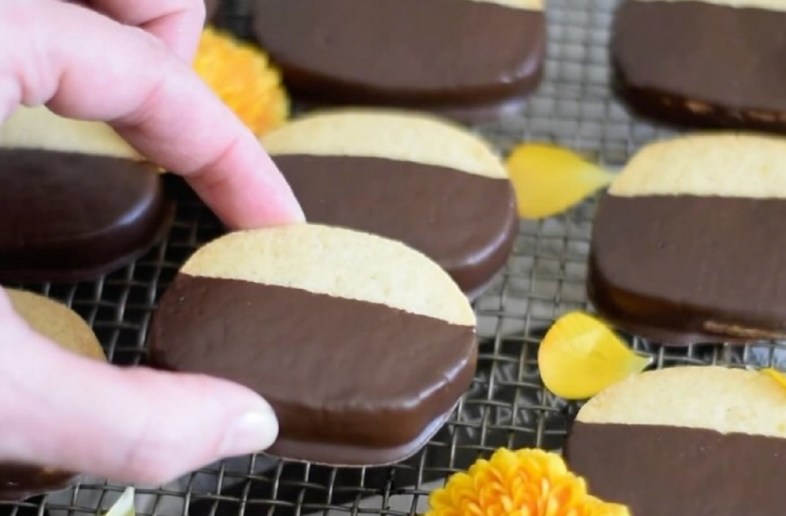 Cortar las cookies, coloca en placas. Hornear en horno precalentado 180° C por 12 minutos. Apoyar en rejilla y dejar enfriar. Paso seguido, sumergir la mitad de cada cookie en baño de chocolate. Ahora a disfrutar.