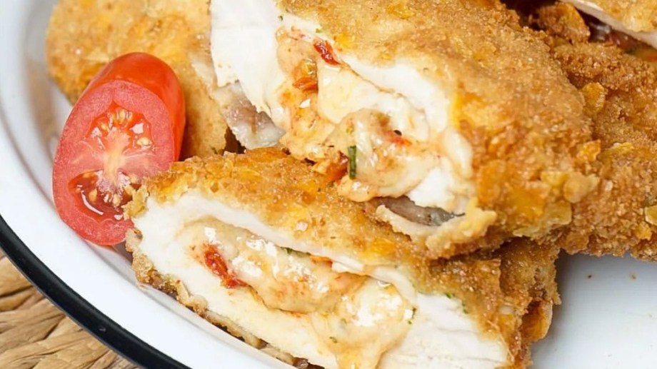 Abrimos 1 pechuga con el clásico bolsillito y salamos. Por otro lado hacemos el relleno. Yo le puse albahaca, tomates secos hidratados, mozzarella, un poquito de ajo, apenitas de sal y 1 cucharadita de mostaza dijon. Vas a unir todos los elementos y lo vas a incorporar el bolsillito que le hicimos a la pechuga.