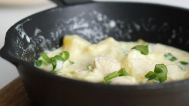 Para el pollo: Picamos la cebolla de verdeo (dejamos parte de lo verde para sumarlo al final), cortamos las manzanas peladas y las pechugas en cubitos. Se pone todo directo en la cacerola o sartén, agregan la crema, condimentos y lo cocina por unos 20 minutos.