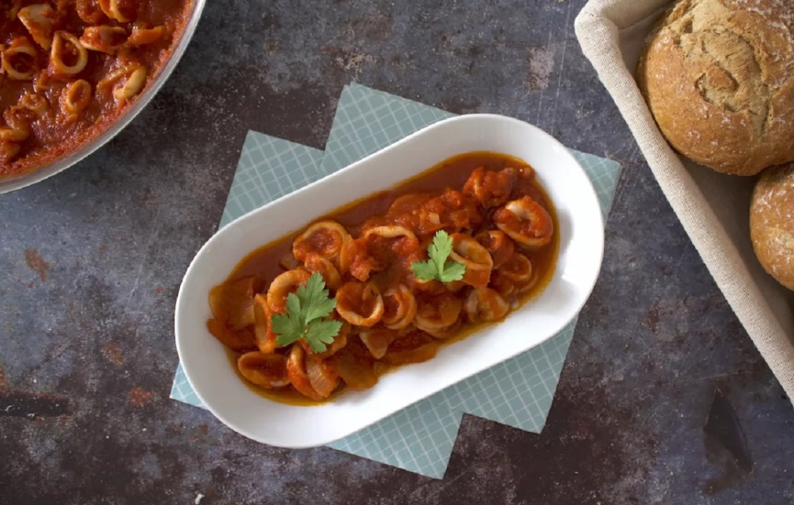 2. En una olla poner aceite y cuando esté caliente agregar los calamares y dorar a fuego fuerte por unos 3 minutos, revolviendo de vez en cuando.
