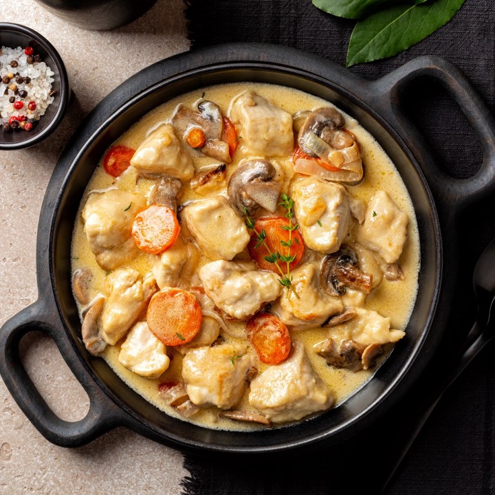 3. Agregar la harina y cuando empiece a tomar color dorado, agregar el pollo. Añadir el laurel y el vino. Salpimentar. Cocinar tapado a fuego suave por 20 minutos.